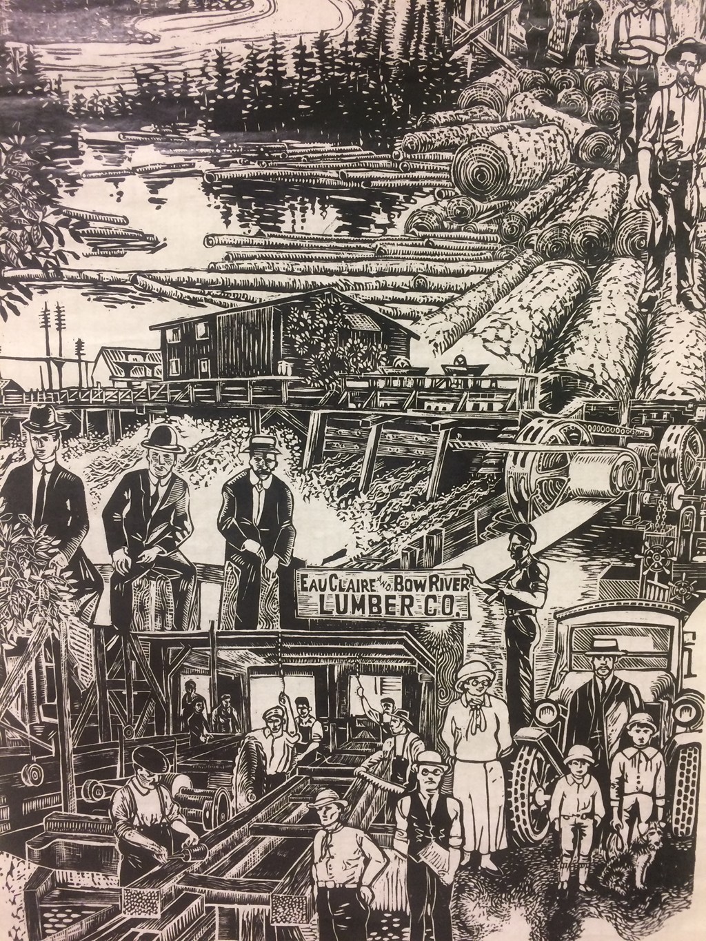 This large woodcut tells the history of the Eau Claire Lumber Mill, form logging in the Kanaskis area, floating the lumber down the Bow River to Prince's Island, to the sawmill in the city. The river also generated electricity for the lumber mill. The mill was relocated to Heritage Park and can be seen there. Much of the wood was used for the railway stays of the developing Canadian Pacific Railway Company.